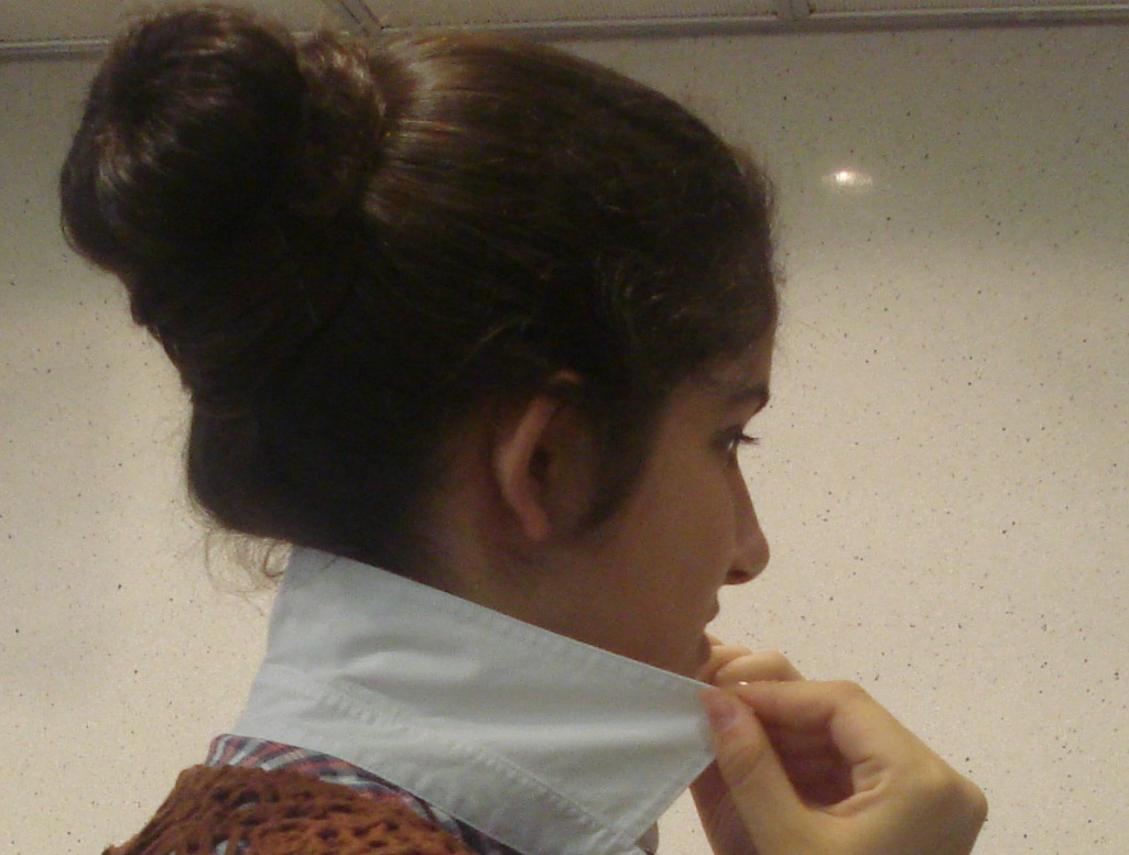 1·Nos hacemos una coleta con la goma del pelo e introducimos el mechón dentro del agujero del ''donut''